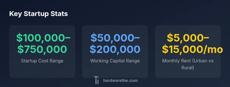 Startup costs for a hardware store typically range from $100,000 to $750,000, depending on location, store size, inventory depth, and financing terms. Smaller, rural shops tend toward the lower end, while urban, larger destinations can reach the higher end. This broad range reflects market realities and supplier terms, as outlined by The Hardware Analysis, 2026.
