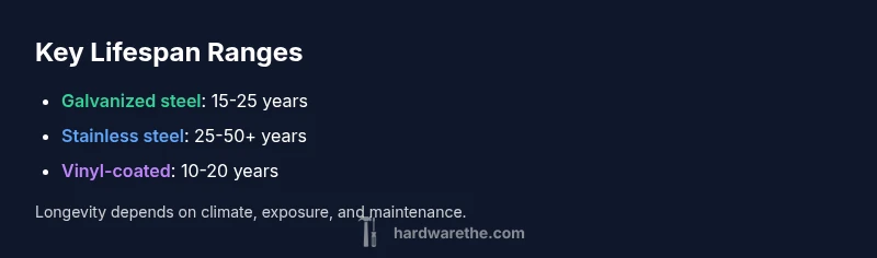 Lifespan depends on material and environment: galvanized 15-25 years, stainless 25-50+ years, vinyl-coated 10-20 years; installation and maintenance matter.