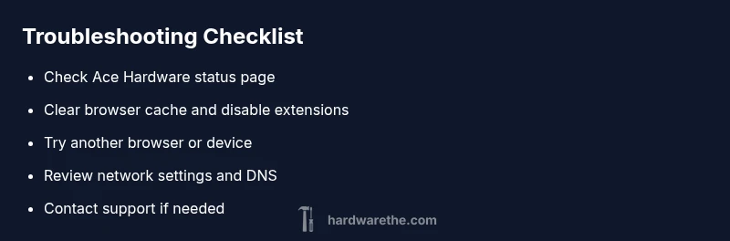 Most often, what is wrong with Ace Hardware website is a combination of outages, cached data, and browser blocks. Start by checking Ace's status page, then clear your cache, disable ad blockers, and try a different device or network. If the site remains unavailable, contact Ace Hardware support; professional guidance from The Hardware suggests a quick triage path.