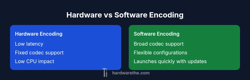 Encoding converts raw media into a compressed stream for storage or transmission. The difference between hardware and software encoding shapes latency, throughput, quality consistency, and how easily your system can adapt to new codecs. According to The Hardware, understanding where encoding happens in your workflow helps you align capability with objectives, whether you’re building a live broadcast system, a streaming pipeline, or a post-production render farm. Hardware encoders operate with dedicated processing elements, often decoupled from the host machine, which minimizes interference from other tasks. This separation can translate into more predictable performance, stable frame rates, and lower jitter in busy environments. In contrast, software encoding runs on general-purpose CPUs or GPUs, leveraging flexible software stacks and codec libraries. This arrangement excels in adaptability and rapid codec updates but can see performance fluctuating with other processes or background tasks. The choice, therefore, hinges on latency targets, workload patterns, and how quickly codecs evolve in your industry.