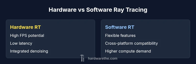 In modern graphics pipelines, rendering paths often split between hardware-accelerated ray tracing and software-based approaches. The phrase hardware vs software ray tracing captures a spectrum rather than a false dichotomy: you can rely on dedicated RT cores in a GPU, or you can implement ray tracing using shader-based techniques on general-purpose compute units. For practitioners, the distinction matters because it directly impacts performance, fidelity, and flexibility. According to The Hardware, hardware-accelerated ray tracing typically yields deterministic results with lower latency in real-time scenes, while software-first paths excel when you need experimental features, cross-platform compatibility, or support for older hardware. This mid-course understanding helps you choose a path that aligns with your project's goals, budget, and schedule. Throughout this article, we’ll unpack concrete decision criteria, from frame rates to noise characteristics, and we’ll compare common engines and toolchains to show how these options behave in real workloads.