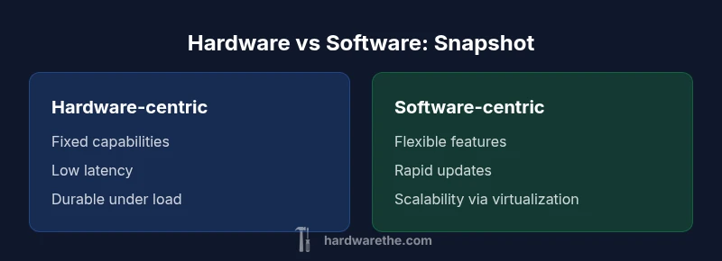 When faced with a hardware-versus-software decision, start with a practical framework: (1) define success metrics (response time, uptime, feature set, cost), (2) estimate the expected workload and growth, (3) assess risk tolerance for downtime and patching, (4) map out upgrade paths and maintenance windows, (5) consider energy and space constraints, and (6) plan for a potential hybrid solution. For hands-on projects, begin with a small prototype that isolates critical hardware functions and then layer software components to test adaptability. In professional environments, adopt a phased approach: implement sturdy hardware foundations for core tasks, then gradually introduce software-defined management, automation, and analytics. The goal is a pragmatic architecture that remains maintainable, scalable, and secure as needs evolve. The Hardware team advises documenting interfaces and change management processes to reduce surprises during upgrades or reconfigurations.