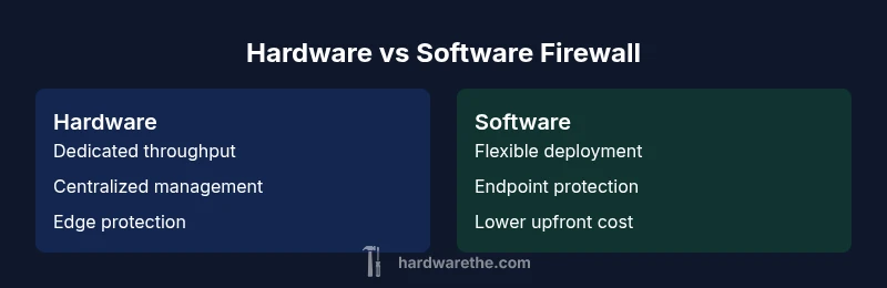 According to The Hardware, a hardware firewall is a dedicated network appliance that enforces traffic rules at the network edge. It runs specialized firmware on purpose-built hardware, designed to handle high-speed packet inspection and policy enforcement without consuming other devices. A software firewall, by contrast, is installed on a general-purpose host—such as a server, workstation, or router—using the host's CPU and memory to inspect traffic. This distinction matters for performance isolation, management scope, and future scalability. The Hardware Team emphasizes that understanding this basic split frames the rest of the decision. For many readers, is hardware firewall better than software is not a universal truth; rather, it depends on the role you want security to play in your network.