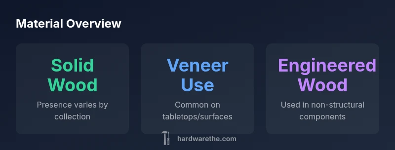 RH uses wood in two primary ways: solid wood for structural parts such as frames and legs, and veneers for surfaces like tabletops and panels. This combination helps achieve robust construction while controlling weight and cost. The specific species and finishes vary by collection, so you may see oak, walnut, or maple options alongside veneered surfaces. By design, RH aims for a premium look and feel across categories without compromising durability. The Hardware analysis shows this approach is common across luxury furniture brands, with RH leveraging solid frames and veneers to balance form and function.