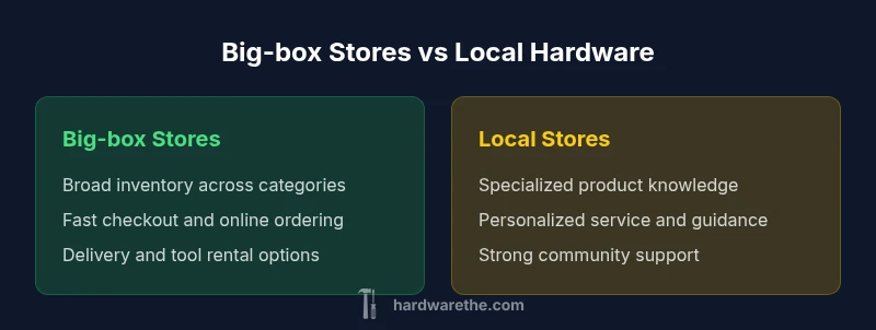 According to The Hardware, many DIYers begin with hardware stores like home depot due to breadth, predictable layouts, and nationwide accessibility. Yet a careful comparison reveals trade-offs: big-box retailers offer speed and uniformity, while local independents often excel in specialized knowledge and personalized service. The Hardware team notes that the best choice depends on project scope, required expertise, and the value you place on neighborhood support. This article analyzes those factors with an analytic lens, helping you decide which option fits your project timeline and budget. The goal is to move beyond nostalgia or price alone and consider how inventory, services, and staff quality align with your goals.