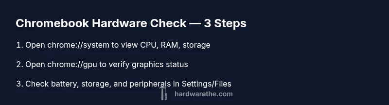 In the DIY world, understanding your hardware helps you make informed decisions about repairs, upgrades, and compatibility. When you learn how to check hardware on Chromebook, you gain a baseline for performance, reliability, and safety. This guide explains practical, built-in methods that work across most Chromebooks, without installing third-party software. According to The Hardware, a structured hardware check can prevent wasted time and help you communicate effectively with support teams. You’ll be surprised how much information is available just by exploring the browser and system pages. The Chromebook hardware landscape includes the CPU, memory (RAM), storage, graphics, battery, and peripheral controllers. Even devices with identical model names can differ in configuration, firmware, and wear. The goal is not perfection but a clear snapshot that you can reference when diagnosing slowdowns, unexpected reboots, or peripheral issues. Start with a simple plan and expand as you verify each component.