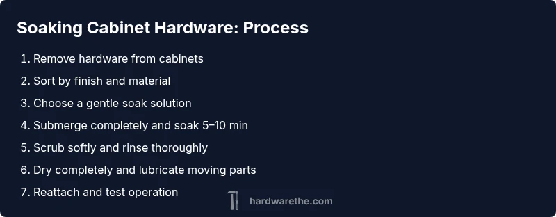 Soaking is a targeted cleaning step for metal cabinet hardware like knobs, pulls, and hinges. It helps loosen grime, mineral deposits, and tarnish without scrubbing excessively. Before you start, remove hardware from doors and drawers, then group parts by material and finish. The Hardware recommends a gentle first pass because aggressive chemicals or long soaks can degrade plating, lacquer, or coatings. Never soak wooden components, rubber gaskets, or painted finishes; these can swell or blister, and the grain may trap remaining grime. By clarifying what qualifies for soaking, you protect the hardware’s finish and extend its life while delivering shine and smooth operation on reinstallation. This approach aligns with best practices from professional restorers and DIY guides alike, emphasizing patience, surface-safe chemistry, and thorough drying to prevent rust.