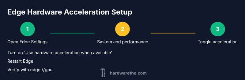 Step-by-step: Open Edge Settings and go to System and performance; Toggle Use hardware acceleration when available to On; Restart Edge; After restart, open edge://gpu to verify; Look for a status indicator showing hardware acceleration is active. If the page shows disabled or unsupported, re-check drivers and OS compatibility, and make sure no extensions or themes are interfering. For a quick confirmation, try a graphics-heavy page and compare frame rate and scrolling smoothness.